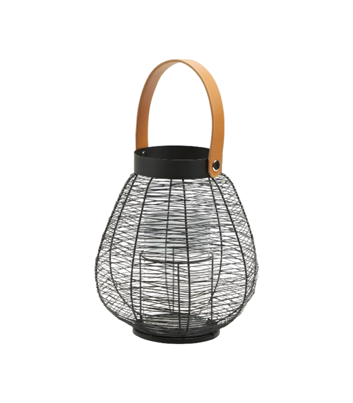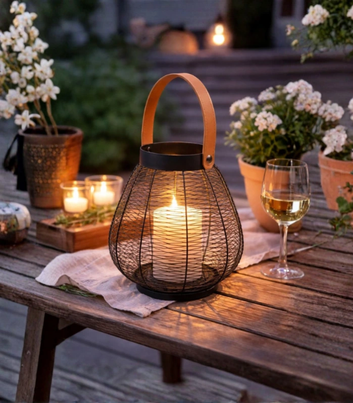 Metalni svijećnjak s kožnom ručkom elegantan je dekorativni element koji unosi toplinu i atmosferu u svaki prostor. Izrađen od metala s prozračnom žičanom strukturom, omogućuje lijepu igru svjetla i sjene kada je svijeća upaljena, stvarajući ugodan i smirujući ambijent.